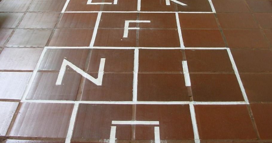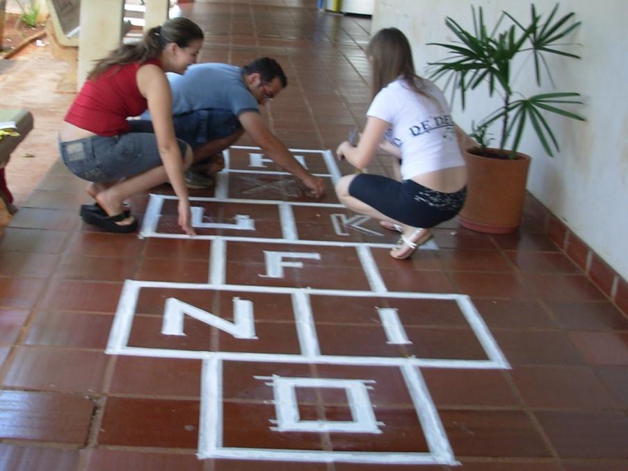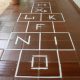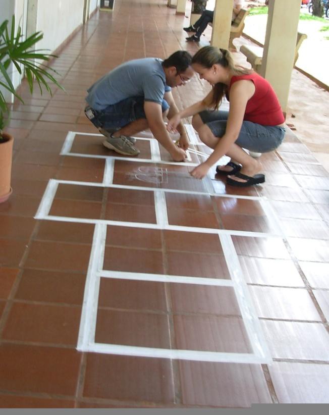 1. O CORPO DA AMARELINHA: para desenhar os quadros da amarelinha química, se for possível, utilize a medida das lajotas do próprio piso, por exemplo, um piso com uma lajotas 28×28 cm (como nós realizamos) resultou em um quadrado 60×60 cm, pois foram utilizadas 4 lajotas com um espaçamento de 2 cm entre elas. Para pintura passamos fita crepe nas laterais do quadro, deixando um espaço interno de 2 cm entre uma fita e outra para pintar posteriormente o tracejado do quadro. A pintura pode ser feita com tinta epóxi ou tinta acrílica para uma pintura mais duradoura. Pode-se também utilizar tinta PVA, caso a área seja interna ou se o piso for de cimento. O desenho do corpo da amarelinha pode variar de tamanho, estilo, cor, etc. de acordo com o local e a cultura regional. A regra geral é que esta deve ser composta por quadros ou retângulos de igual tamanho posicionados em seqüência simples ou duplos.