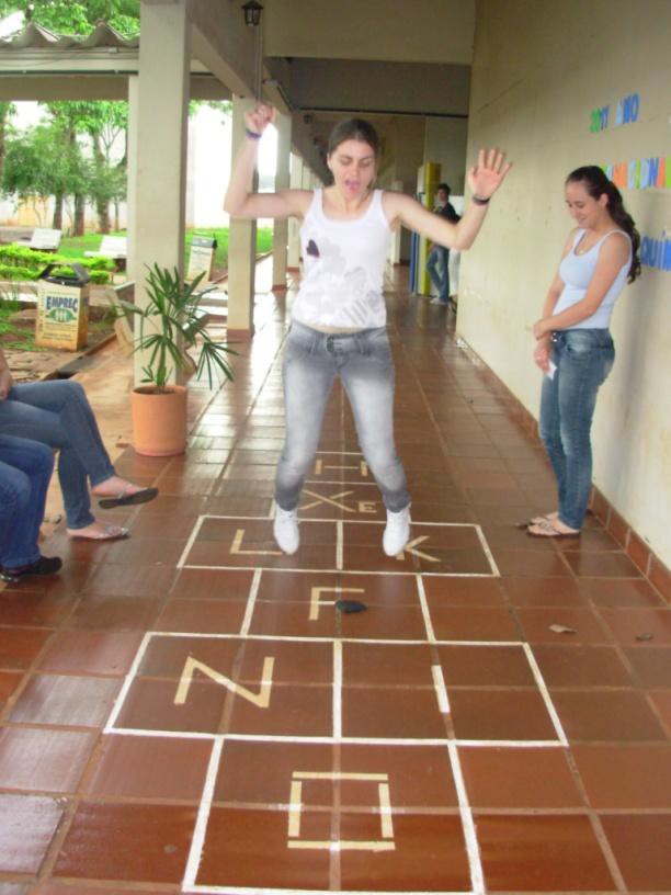 4. PULANDO AMARELINHA QUÍMICA: para brincar na amarelinha química fizemos dois saquinhos de mapa com enchimento de areia. Cada jogador inicia – na nossa amarelinha – pelo hidrogênio (1). Joga o saquinho de areia na casa inicial, fala o nome do elemento químico e cita uma característica do elemento (tipo estado físico, posição na tabela periódica, número atômico, distribuição eletrônica, etc.). Cada grupo de jogadores pode estipular suas regras próprias, dependendo do nível de conhecimento de cada um. Como brincar de amarelinha não tem idade podemos fazer esta brincadeira com crianças inserindo, assim elas no contexto da linguagem química. No caso das crianças, os adultos podem ajudá-las dizendo o nome dos elementos.