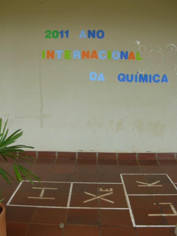 2. OS SÍMBOLOS DOS ELEMENTOS: os símbolos dos elementos químicos são desenhados no interior de cada quadro. A escolha dos símbolos é aleatória, podendo variar de uma amarelinha para outra. Para o desenho das letras utilizamos a mesma técnica de contorno com fita crepe utilizada para construir os quadros da amarelinha. Feito o desenho de cada símbolo com régua e giz e seu contorno com a fita crepe, fizemos a pintura do espaço interno. A amarelinha também poderá ser construída para fins didáticos, ou seja, se um professor desejar poderá utilizá-la como um recurso lúdico para que seus alunos identifiquem os símbolos dos elementos químicos. Neste caso pode-se desenhar o corpo da amarelinha no chão e escrever os símbolos com giz de modo que estes possam ser facilmente apagados e substituídos por outros. Assim um maior número de elementos pode ser trabalhado em curtos períodos de tempo. Uma sugestão, neste caso, pode ser a troca semanal dos símbolos.