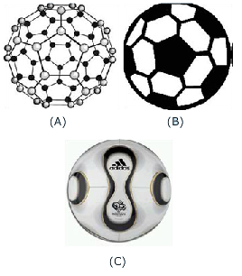 Na Copa de 70, surgiu o modelo revolucionário da bola de 32 gomos, denominada à época de “Telstar”, um satélite de comunicações esférico lançado na Flórida, em 1962. A bola de couro de 32 gomos, com hexágonos brancos e pentágonos pretos (b, figura abaixo), tinha uma grande semelhança com o satélite, com seu fundo coberto de painéis escuros. Este modelo é igual à molécula esférica do fulereno (a, figura baixo), que é formada apenas por átomos de carbono, e também é chamada de buckybola.