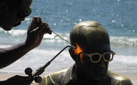 Imagem da restauração da escultura em homenagem ao poeta Carlos Drummond de Andrade, que fica na praia de Copacabana, na cidade do Rio de Janeiro