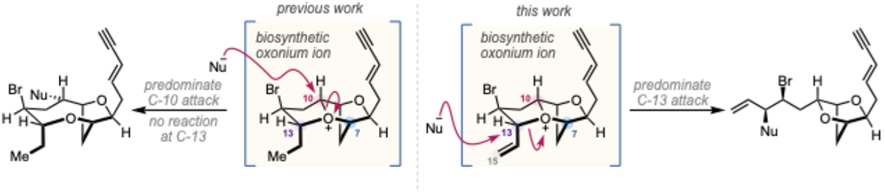 Trialkyl oxonium ions have been proposed as intermediates in the biosynthesis of numerous C15-halogenated natural products from Laurencia species.1,2 Previously we have reported the synthesis and characterization (low T NMR) of four of these trialkyl oxonium ions, and demonstrated their reaction with a range of nucleophiles, at two of the three electrophilic sites (C-10 and C-7), to yield numerous natural products; notably the reaction of nucleophiles at C-13 was not observed (Figure 1).3,4