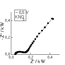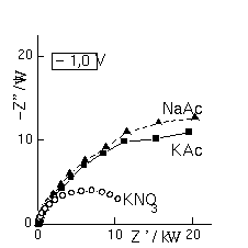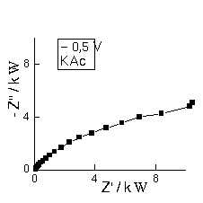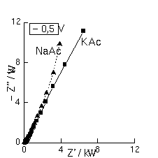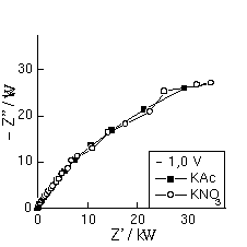 As medições de impedância foram realizadas usando-se um analisador de resposta em frequência Solartron 1250 acoplado a um potenciostasto Solartron 1286, na faixa de frequência de 65 kHz a 0,1 Hz, sobrepondo um potencial sinusoidal de 10 mV. Usaram-se um eletrodo de carbono vítreo de 6 mm de diâmetro (trabalho), eletrodo de fio de platina (auxiliar) e eletrodo de calomelano saturado (referência). Os eletrólitos: KNO3 0,1 M / HNO3 5 mM, tampão acetato de sódio e de potássio 0,1M (pH 4,6) foram utilizados.