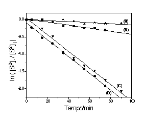 Figura 1 - Variação relativa de sulfeto com o tempo. Condições: tampão H2PO4- / HPO42-; pH: 6,7; força iônica: 0,4 mol.L-1 a temperatura de 25 0C; [O2]inicial = 1,0 x 10-3 mol.L-1; [S2-]inicial = 1,0 x 10-4 mol.L-1; concentração dos catalisadores = 5,0 x 10-7 mol.L-1. (A) sem catalisador; (B) [Fe(III)PcTs]; (C) [Mn(III)PcTs]; (D) [Co(II)PcTs].