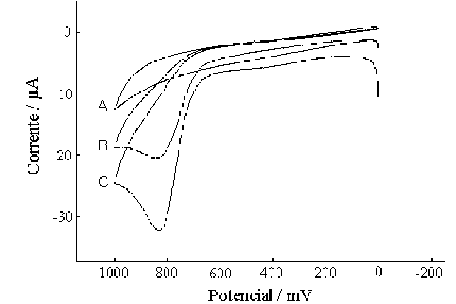 Figura 1: Voltamogramas para solução de nitrito 1 mM em solução tampão pH = 9 obtidos com eletrodo de carbono vítreo antes (B) e após (C) a modificação com filme de óxido de molibdênio. A = voltamograma do eletrólito suporte com eletrodo modificado. Velocidade de varredura = 50 mV/s.