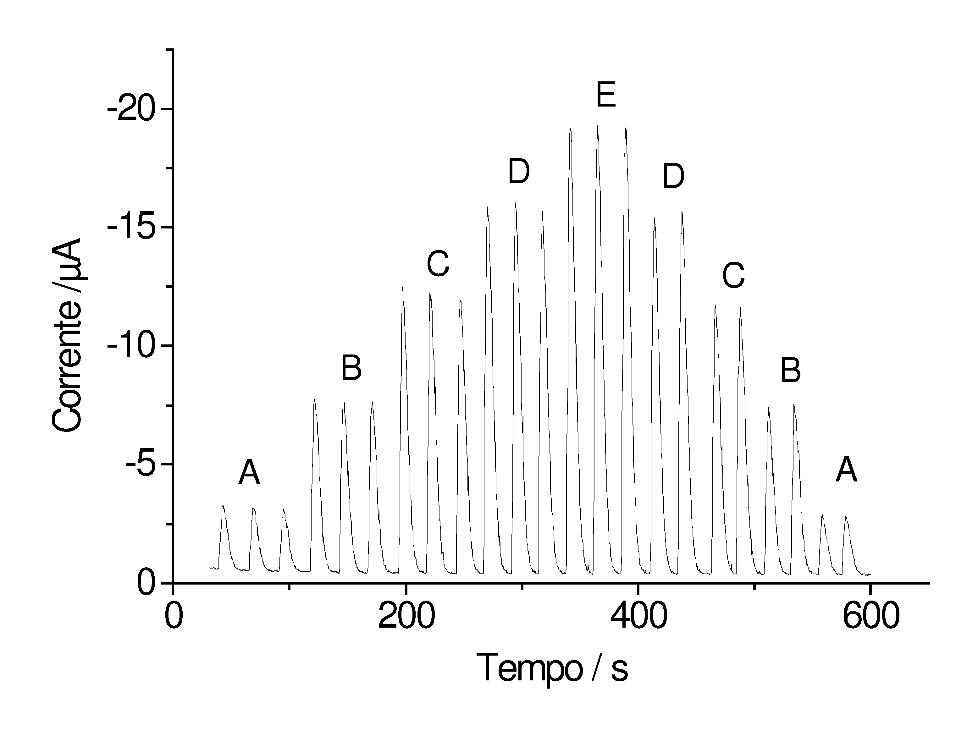 Figura 2: Injeções de soluções de nitrito (A = 0,1; B = 0,3; C = 0,5; D = 0,7; E = 0,9 mM) num fluxo de tampão pH = 9 (2,8 mL/min). Eletrodo modificado polarizado em 1,0 V. Loop de amostragem = 0,13 mL.