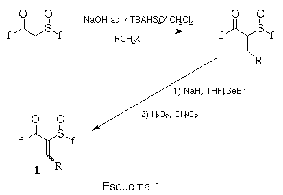 Metodologia: A obtenção das a-sulfinil enonas 1, envolve duas etapas: a) alquilação dos b-ceto-sulfóxidos realizada em condições de catálise de transferência de fase (c.t.f.), b) selenização e posterior oxidação do alquil b-cetossulfóxido, conforme mostrado no Esquema-1.