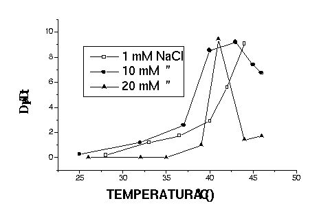 Figura 1: Variação da taxa de fusão de vesículas sonicadas de DODAC em função da temperatura para diferentes concentrações de sal.