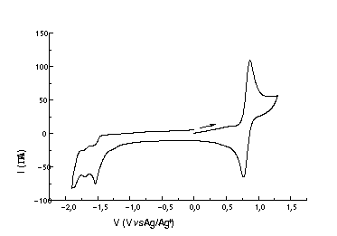 Figura 1: Voltamograma cíclico do [Ru(bpy)2H2V]+. Concentração: 2 mmol L-1; solvente: acetonitrila; eletrodo de trabalho: platina; eletrodo de referência: Ag/AgNO3 0,01 mol L-1; eletrólito suporte: PTBA 0,1 mol L-1, velocidade de varredura: 100 mV s-1.