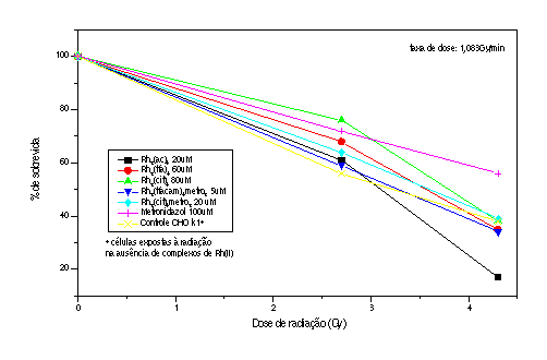 Os efeitos da radiação sobre as células CHO k1, na presença dos complexos de Rh (II) em concentrações atóxicas, são mostrados no gráfico abaixo.