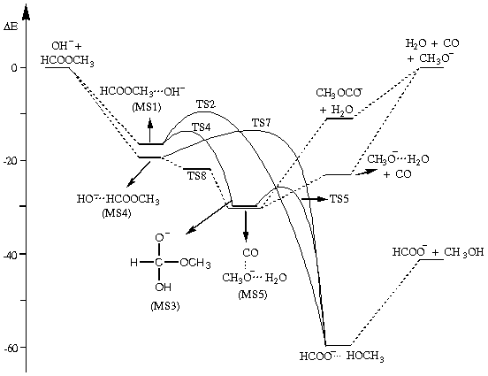 A aproximação do íon hidroxila do formiato de metila leva a duas estruturas preferenciais: MS1 e MS4, os quais são complexos do tipo íon-dipolo. Entretanto, a estrutura MS4 não sobrevive como mínimo quando a base e o nível de correlação são estendidos, de modo que a aproximação do hidroxila desta posição na molécula deve levar diretamente a MS5. O caminho a ser seguido por este complexo é a perda de CO e formação do complexo água-metóxido. No caso dos reagentes terem excesso de energia, a dissociação de MS5 pode ser completa, levando a monóxido de carbono, água e metóxido, o que de fato é observado experimentalmente. O complexo MS1 pode se rearranjar pelos caminhos envolvendo os estados de transição TS2 e TS4. O caminho através do TS2 corresponde a um mecanismo Sn2, enquanto através do TS4 envolve o intermediário tetraédrico. Nossos cálculos sugerem que TS4 é o caminho preferencial, o que também é consistente com as observações experimentais. Em suma, o presente estudo apresenta uma visão geral da superfície de energia potencial para esta reação em fase gasosa, e racionaliza os dados experimentais. O estudo desta reação em fase líquida está em andamento.