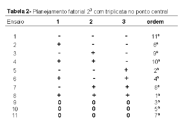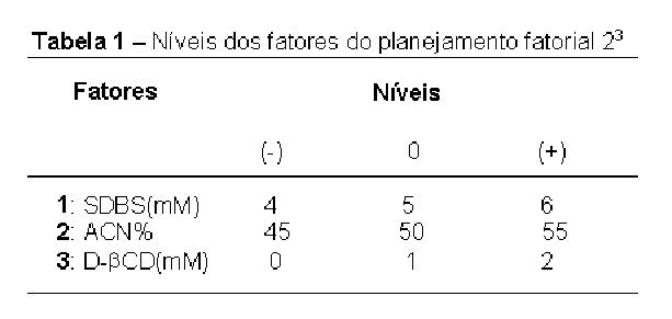 Os experimentos foram realizados no equipamento de eletroforese capilar modelo 270-HT da Applied Biosystems/PE com programa de aquisição de dados turbochromTM software. Um capilar de sílica fundida (75 mm d.i. x 77cm comp.) foi usado como coluna de separação. A amostra foi injetada por pressão 5 Hg durante 1 seg. A separação eletroforética foi conduzida sob voltagem constante de + 30 kV, com 5 mmol L-1 de tampão borato em pH ~ 9, contendo aditivos listado na tabela 1, e detecção indireta por UV em 224 nm. Estas condições foram obedecidas para todos os ensaios. A tabela 1 ainda mostra o nível dos fatores e a tabela 2 mostra o planejamento dos experimentos.