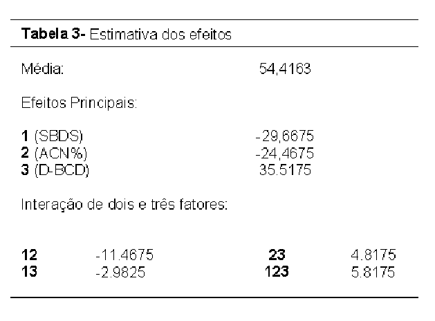 De acordo com a tabela 3, pode-se observar quais são os efeitos que tem interação positiva e quais tem interação negativa no sentido de obter uma melhor separação dos ácidos graxos. O efeito negativo da ACN pode ser explicado, pois o aumento da mesma diminui o fluxo eletroosmótico e pode ocasionar formação de bolhas interrompendo a corrente. O efeito negativo apresentado pelo aumento da concentração de SDBS ocorre devido ao fato de que o mesmo só atua como cromóforo, uma vez que as micelas não chegam a se formar devido a presença de ACN. O efeito positivo determinado a partir do aumento da concentração da D-bCD ocorre porque essa substância é a única responsável pela maior discriminação entre as moléculas. O resíduo obtido está abaixo de 10%, ou seja, a modelagem proposta apresentou resultados satisfatórios.