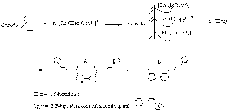 A fixação do complexo de ródio contendo ligantes quirais no eletrodo é limitada pela escassa quantidade de ligantes pirrólicos que podem ser efetivamente sintetizados e eletropolimerizados diretamente na superfície do eletrodo.1,2 Isto porque o ligante pode se degradar de maneira irreversível no potencial aplicado durante a eletropolimerização, seja porque se oxida irreversivelmente, ou por causa da sua reatividade no solvente. Assim, foi utilizada uma nova abordagem para a incorporação do ligante quiral no eletrodo.