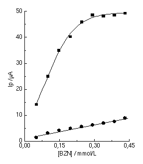 A solução estoque de DNA Calf Thymus (sal sódico, tipo I) desnaturado foi efetuada dissolvendo-se cerca de 3 mg de DNA em 0,5 mL de HClO4 60%, seguida da adição de 0,5 mL de NaOH 9,0 mol/L e completou-se o volume a 50 mL com tampão acetato pH 4,5. A solução estoque de BZN 0,01 mol/L foi preparada com etanol 80%. Preparou-se o tampão universal a partir da mistura de ácidos fosfórico, acético e bórico com NaOH. Utilizou-se potenciostato mAutolab acoplado a célula eletroquímica de 10 mL com sistema de três eletrodos: carbono vítreo (ECV) e ECV-DNA como eletrodos de trabalho, eletrodo Ag/AgCl referência e Pt como eletrodo auxiliar. A aquisição e tratamento de dados foi efetuada por meio do software GPES versão 4.1 da Eco-Chemie, Holanda.