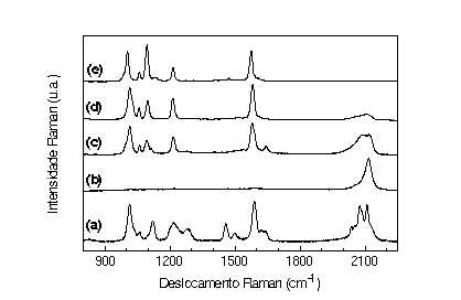Figura 1. Espectro Raman do K3[Ru(CN)5(pyS)] sólido (a); espectros SERS em -0,6V do complexo [Ru(CN)5(pyS)]3- em H2O / KCl 0,1 M adsorvido em eletrodos de Au (b), Cu (c) e Ag (d) ; espectro SERS em -0,6V do complexo [Ru(CN)5(pyS)]3- em acetonitrila / NaClO4 0,1 M adsorvido em eletrodo de Ag (e). lexc. = 632,8 nm. |