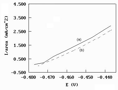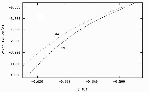 Nas figuras A e B são apresentadas as curvas de polarização anódica e catódica para o aço 1010 em meio de HCl 0,5 mol/L na ausência (a) e presença (b) de filme previamente formado com uma eficiência da ordem de 20%. A presença do filme é observada em toda a faixa de potenciais estudada.