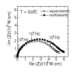 A solução sólida do sistema Na0,88Li0,12NbO3 foi realizada a partir de um sal solúvel de nióbio, NH4[NbO(C2O4)3]3H2O, fornecido pela Companhia Brasileira de Metalurgia e Mineração-CBMM, e de nitratos de sódio e lítio3. O pó obtido foi compactado em forma de pastilhas e sinterizado durante duas horas a 1100 oC. As amostras obtidas apresentaram diâmetro entre 11 a 12 mm e espessura em torno de 1,5 mm, com densidade relativa de 97%. A caracterização elétrica da solução sólida foi realizada por espectroscopia de impedância no intervalo de freqüência de 5 Hz a 13 MHz (analisador de impedância HEWLETT-PACKARD modelo HP4192A ALF). As medidas foram realizadas em três ciclos térmicos, sob atmosfera de ar. Cada ciclo constituiu-se de medidas efetuadas em aquecimento a partir da temperatura ambiente até 800 oC, seguido de medidas realizadas em resfriamento de 800 oC até a temperatura ambiente. O intervalo de temperatura entre cada medida foi de 50 oC.