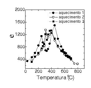 A estabilidade térmica das propriedades elétricas e dielétricas do sistema Na0,88Li0,12NbO3 foi avaliada em função de ciclos térmicos (aquecimento-resfriamento). Diferentes valores de resistividade foram encontrados entre o aquecimento e resfriamento (Figura 1). Estas diferenças diminuem com o número de ciclos para temperaturas inferiores à 600 oC. A Figura 2 mostra as curvas de permissividade (e) em função da temperatura obtidas em três ciclos térmicos estudados. Três diferentes máximos são identificados na curva da permissividade, os quais foram atribuídos às transições de fases ortorrômbica-tetragonal, tetragonal - pseudo-cúbica e pseudo-cúbica - cúbica, respectivamente. À medida que, os ciclos térmicos são realizados a intensidade e a posição dos picos mudam, em particular observa-se uma diminuição do intervalo térmico entre as transições, resultando em uma superposição dos picos a 350 oC no terceiro ciclo térmico (Figura 2). Após estes tratamentos cíclicos, a amostra cerâmica foi submetida a um novo tratamento térmico. Novas medidas dielétricas foram efetuadas, onde observou-se então o mesmo comportamento da curva exT, encontrado no primeiro ciclo térmico de medida. As diferenças de resistividade entre o aquecimento e o resfriamento, abaixo de 600 oC, bem como as modificações na curva da permisssividade em função da temperatura, sugerem que a cada ciclo térmico persistem diferentes frações de fases, em particular de baixa simetria.