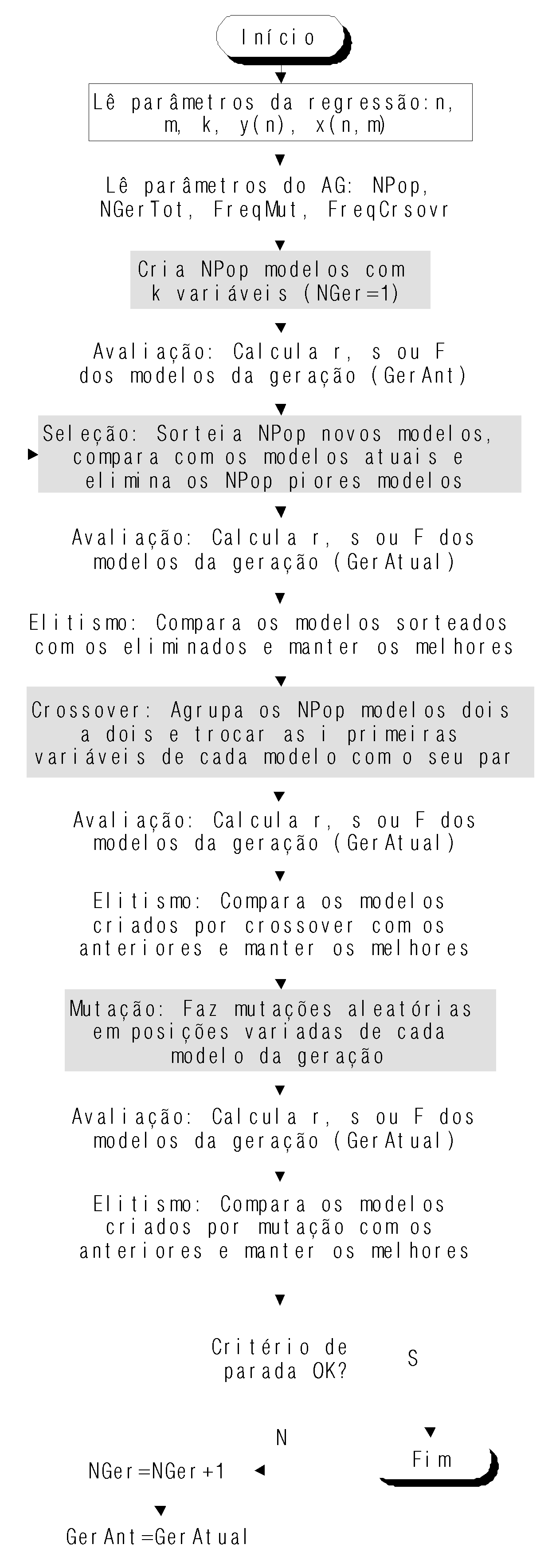 Metodologia. A construção do algoritmo proposto foi feita a partir da análise de AGs já disponíveis na literatura, sendo que alguns deles já foram adaptados para executar seleção de variáveis em modelos lineares.2 Apesar de todos os AGs apresentarem a mesma estrutura básica, o presente algoritmo apresenta características particulares relativas à forma com que as etapas evolutivas são implementadas. O algoritmo inclui as três etapas evolucionárias mencionadas na introdução deste trabalho, na seguinte ordem: seleção, crossover e mutação. O algoritmo é estruturado e de arquitetura top-down. Na verdade, o presente algoritmo está sendo codificado em linguagem Delphi como uma subrotina a ser incorporada ao programa QSAR.7