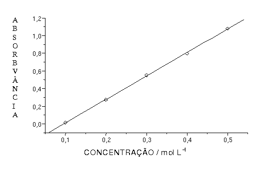 Uma solução matriz de sulfato de cobre pentaidratado foi preparada, e utilizada para a obtenção de padrões de concentrações variando de 0,1 mol/L a 0,5 mol/L e para a determinação de uma curva de calibração, em l= 670nm.