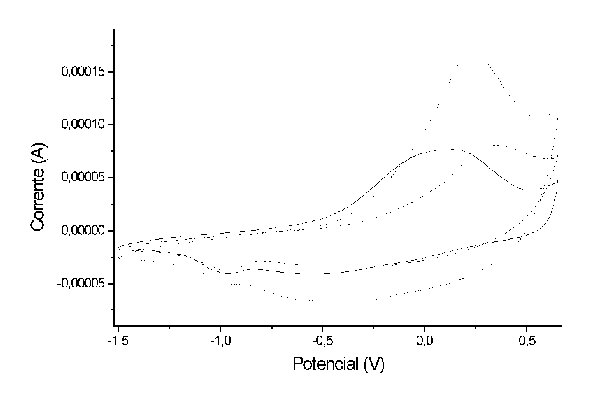 As análises de voltametria cíclica foram feitas com uma solução 0.5mol/L de LiClO4 em carbonato de propileno. O eletrodo de referência utilizado foi Ag/AgCl e usou-se um eletrodo de platina como auxiliar. A velocidade de varredura foi 1mV/s entre os potenciais +0,65 e -1,5V, que é a faixa de potencial de estabilidade do carbonato de propileno.