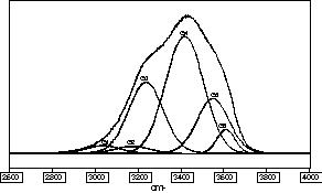 Com este método obteve-se para a base um conjunto de seis bandas, centradas em: 3038, 3174, 3237, 3416, 3550 e 3628 cm-1. Com este conjunto podemos reproduzir não somente os espectros da água como também os de soluções de LiClO4 (fig.4).