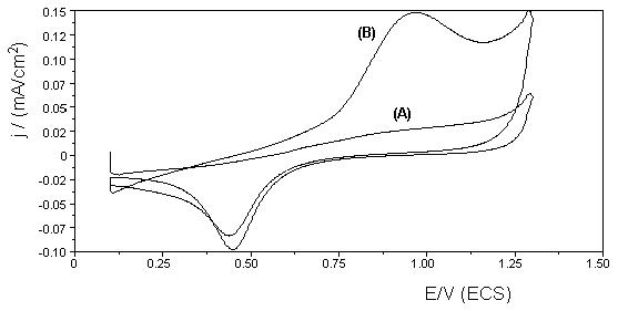 O processo eletrooxidativo do furfural sobre o eletrodo de platina, pode ser visualizado na figura 1. Nela, são apresentados os voltamogramas cíclicos da platina em ácido sulfúrico 0,50 M na ausência e na presença de furfural 80 mM. O intervalo de potencial estudado ficou entre 0,10V e 1,30V (ECS).