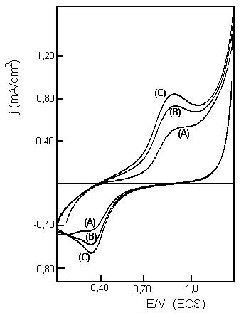Todos os voltamogramas apresentados referêm-se à um tempo de adsorção (tads) nulo. Observa-se o aparecimento de um pico de corrente durante a varredura anódica, em torno de 0,97 V (ECS). O processo é totalmente irreversível. A presença do orgânico, também diminui a carga associada à eletroredução da camada de óxido de platina formado, durante a varredura de volta. Este efeito indica um bloqueio dos sítios ativos do metal.