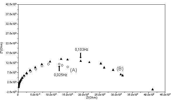 Diagrama de Nyquist para o eletrodo de Pt (A) e o modificado (B), em