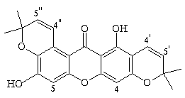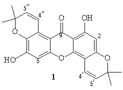 Experimental. Raízes (1270 g) e caules (2400 g), coletadas no município de Acará/PA, foram extraídos em Soxhlet sucessivamente com n-C6H14, CH2Cl2 e MeOH. Após concentração dos solventes, os extratos diclometânicos (raízes: 12 g; caules: 18 g) foram cromatografados em coluna de silica gel com n-C6H14 contendo quantidades crescentes de AcOEt para fornecer, após sucessivas recristalizações em MeOH, Ácido betulínico (0,3 g), Friedelina (0,32 g), uma mistura contendo a- e b-Amirinas, Lupeol e Lanosta-7,24-dieno-3b-ol (0,7763 g), e outra contendo b-sitosterol e estigmasterol (0,0186 g). Posterior separação através de filtração em gel [Sephadex LH-20 (MeOH)] e recristalizações em MeOH, as dicromenoxantonas 1 (0,08 g) (das raízes) e 2 (0,0057 g) (oriunda do caules) foram obtidas.