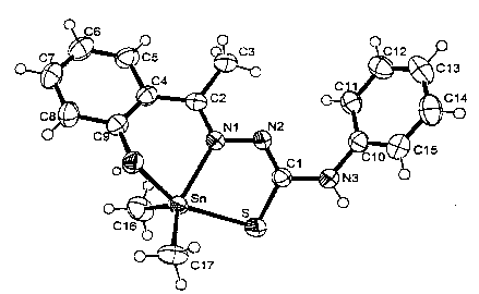 O estudo estrutural por difração de raios X por monocristal mostrou que [Me2Sn(C15H15N3OS)] cristaliza no sistema ortorômbco, grupo espacial Pbca, a = 8,0330(10), b = 18,586(3), c = 24,106(4). A estrutura foi resolvida e refinada até Rw = 0,031, verificando-se que o Sn(IV) é pentacoordenado, com geometria de bipirâmide trigonal bastante distorcida, com a tiossemicarbazona em posição meridional, tricordenada ao metal, via O, N1, S e os dois grupos CH3- em posições equatoriais, junto com N1. Uma molécula esta mostrada na Figura abaixo e a Tabela contém os principais valores de distâncias e ângulos, evidenciando a forte distorção angular em relação à geometria do poliedro de referência.