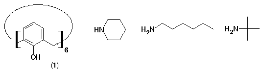 As medidas de UV foram feitas em um aparelho HP-8452 de arranjo de diodos a temperatura de 25° C, usando acetonitrila de grau espectroscópico, e os espectros de RMN foram realizados em um aparelho Bruker-200 Mhz, utilizando MeCN-d3 como solvente; sendo que o espectro de RMN do sal com piperidina não foi realizado devido à sua insolubilidade. As titulações foram acompanhadas pelo crescimento da banda do fenolato a 310 nm, mostrando que o calix[6]areno é completamente desprotonado após a adição de um equivalente de amina, não sendo possível determinar a primeira constante de desprotonação do calix[6]areno ( > 107). Com a adição de mais amina, observa-se um posterior crescimento da banda, atribuído a uma segunda desprotonação do calix[6]areno, bem mais suave do que para a primeira desprotonação. Considerou-se, para o cálculo do valor da segunda constante de transferência de próton, que na estequiometria 1 : 1, o calix[6]areno estivesse completamente desprotonado, e aplicaram-se métodos de regressão não linear. No caso da terc-butilamina, o incremento de absorbância foi muito pequeno, e a constante não pôde ser determinada. Os valores de constantes para a hexilamina e piperidina foram de 6,6 x 103 M-1 e 2,8 x 103 M-1. A hexilamina apresenta uma constante maior à piperidina, que é bem mais básica que as outras aminas. As formação de ligações de hidrogênio entre o cátion amônio e o ânion do calixareno não é o fator preponderante na reação, uma vez que a hexil e a terc-butilamina têm o mesmo número de hidrogênios disponíveis para a formação de ligações de hidrogênio.
