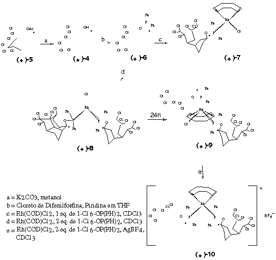 Portanto, ao adicionar-se um equivalente de ligante (+)-6 ao dímero (Rh(COD)Cl)2 obtém-se o complexo (+)-7, cujo o espectro de 31P apresenta dois dubletes em 110 e 91 ppm com constantes de acoplamento 1J(31P-103Rh) de 162 e 149 Hz respectivamente. Por outro lado, ao adicionar-se dois equivalentes de ligante (+)-6 ao dímero (Rh(COD)Cl)2, observa-se, após 1 hora de reação, a formação do complexo (+)-7 e do complexo (+)-8 correspondente ao dublete em 77 ppm com uma constante de acoplamento 1J(31P-103Rh) de 121 Hz. Após 24 horas de reação observa-se o rearranjo do complexo (+)-8 para o complexo (+)-9 caracterizado por dois dubletes em 80 e 77 ppm com constantes de acoplamento 1J(31P 103Rh) de 116 e 120 Hz respectivamente e, por análise elementar de CHN. O complexo catiônico (+)-10 é obtido a partir de (+)-9 ao adicionar-se ao sistema reacional AgBF4. A prata precipita o cloreto sob a forma de AgCl, forçando a formação do centro metálico catiônico e tendo o BF4- como contra-íon. Este complexo foi caraterizado pelo dublete em 100 ppm com uma constante de acoplamento 1J(31P-103Rh) de 155Hz.