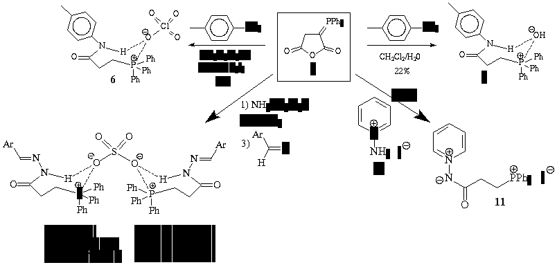 Quando uma solução de 1 em CH2Cl2 foi tratada com t-butilamina não se detectou reação mesmo após oito dias, enquanto que as reações com metilamina, benzilamina, ciclo-hexilamina e pirrolidina forneceram misturas complexas após um dia, e com dietilamina não se observou reação, mesmo seguindo o procedimento descrito na literatura.1 Estes resultados sugerem uma forte dependência estérica nas reações de 1 com aminas alifáticas, onde aminas primárias não impedidas e secundárias cíclicas são muito reativas, enquanto as primárias estericamente impedidas e secundárias acíclicas não reagem. Com aminas aromáticas 1 sofre reação lenta formando produtos de difícil purificação. Com a p-toluidina, pôde-se isolar 5 e 6. O comportamento de 1 frente a N-nucleófilos ambidentados foi investigado, sendo que com hidrazina ocorre uma reação rápida, cuja derivação do produto com aldeídos aromáticos levou à formação de 7-9 em bons rendimentos. A incorporação do ânion sulfato ocorreu durante a etapa de secagem da solução com MgSO4. Com N-nucleófilos bipolares como nitronas e N-óxido de piridina formaram-se misturas complexas, mas com o iodeto de N-aminopiridínio 10 formou-se o produto 11 em bom rendimento (Esquema 2). Todos os compostos foram caracterizados por IV, RMN de próton, carbono e 31P, testes qualitativos para os ânions, bem como análise elementar. A formação de 5-9 e 11 pode ser visualizada através do ataque do nitrogênio do N-nucleófilo ao carbono 5 de 1, seguido de abertura do anel e eliminação de CO2, formando como intermediário um ilídeo não estabilizado que é interceptado pela água do meio.