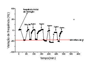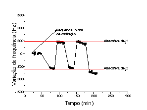 Um experimento típico, utilizando-se o cristal de quartzo com eletrodo de prata à temperatura de 4000C, sobre atmosferas de O2 e H2 é mostrado na Figura 2.