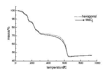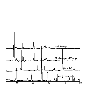 Diferentes formas cristalinas do trióxido de molibidênio (MoO3) são apresentadas na literatura, as quais são denominadas alfa (a), hexagonal e mais recentemente a fase meta-estável chamada gama (b).1 Estes trióxidos apresentam diferentes estruturas, dependendo do arranjos dos átomos de oxigênio e molibidênio. A estrutura lamelar é observada para o a-MoO3, enquanto, as formas b- ou hexagonal assumem estruturas de túnel. O processo de inserção, pode causar um aumento na distância interplanar para a acomodação do intercalante dentro da lamela ou dentro do túnel.