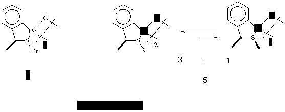 Em resumo complexos paladociclos não-racêmicos de enxofre são facilmente preparados através da paladação direta de tioéteres opticamente ativos. Os complexos contendo grupos substituintes volumosos no átomo de enxofre possuem configuração anti em relação ao grupo benzílico (CHMe) e são configuracionalmente estáveis. Por outro lado, grupos menos volumosos como a metila no átomo de enxofre conduzem a uma mistura de ciclopaladatos diastereoisoméricos que sofrem processos de inversão piramidal.