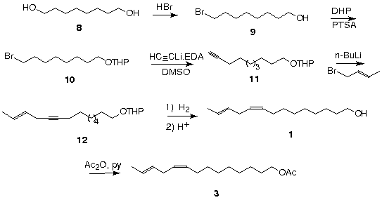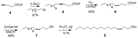 O acetato de (3Z)-3-hexadecenila foi obtido a partir do 3-butin-1-ol comercial, que foi protegido com diidropirano. O acetileto correspondente foi acoplado com o brometo de dodecenila fornecendo 5. Hidrogenação catalítica forneceu 6 (Z/E=94:4), que foi em seguida transformado no álcool 7. Este foi finalmente transformado no acetato 2 na presença de anidrido acético (Esquema 1).
