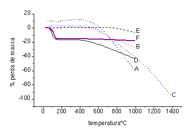 Figura 1  Análise térmica de diferentes compósitos do negro-de-fumo e da polianilina. A(amostra 7); B(amostra 6); C(amostra 5); D(amostra 8); E(NF-Union Carbide); F(PANI).