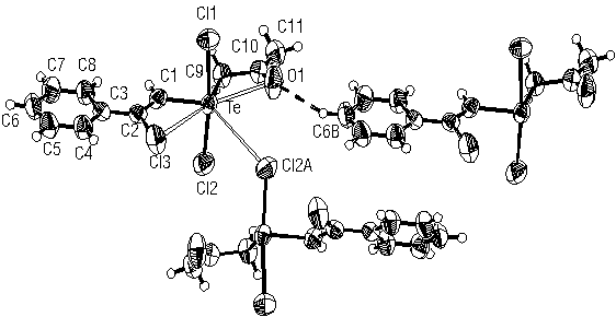 Organyltellurium trichlorides are quite insoluble in the solvents usually used for NMR studies. On the other hand, the corresponding diorganotellurium dichlorides are quite soluble, specially in chloroform. For this reason the organyltellurium trichloride obtained from the reaction of TeCl4 with phenylethyne was treated with an excess of acetone giving the corresponding a-tellurium acetone dichloride which, in turn, was recrystallized from methylene dichloride to give the title compound. As the NMR analysis give no clue on the stereochemistry of the compound an X-ray crystal structure analysis was undertaken.