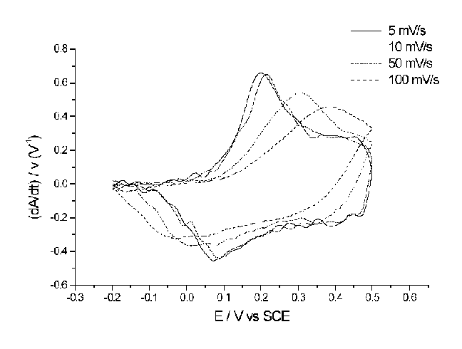 de corrente e dA/dt, normalizados pelas respectivas velocidades de varredura, aparecem na mesma região de potencial. Aumentando a velocidade de varredura (50 e 100 mV/s), nota-se que ocorre um deslocamento dos picos dA/dt em relação aos picos voltamétricos de mesma velocidade para potenciais mais positivos. Isso demonstra claramente que o processo de formação de espécies absorventes ocorre mais lentamente que o processo de transferência de carga. A explicação para esse comportamento pode ser dada considerando o fenômeno carregamento polimérico/variação na coloração, como duas reações em série, apesar da mudança na coloração ser dependente do potencial. A primeira reação é um processo eletroquímico que envolve injeção de carga na matriz polimérica. A segunda reação é um processo químico de relaxação estrutural envolvendo modificações nos orbitais moleculares p. Portanto, conclui-se que a baixas velocidades de variação de potencial, o rearranjo estrutural do polímero ocorre simultaneamente com o processo de carregamento, diferentemente do observado a altas velocidades de varredura.
