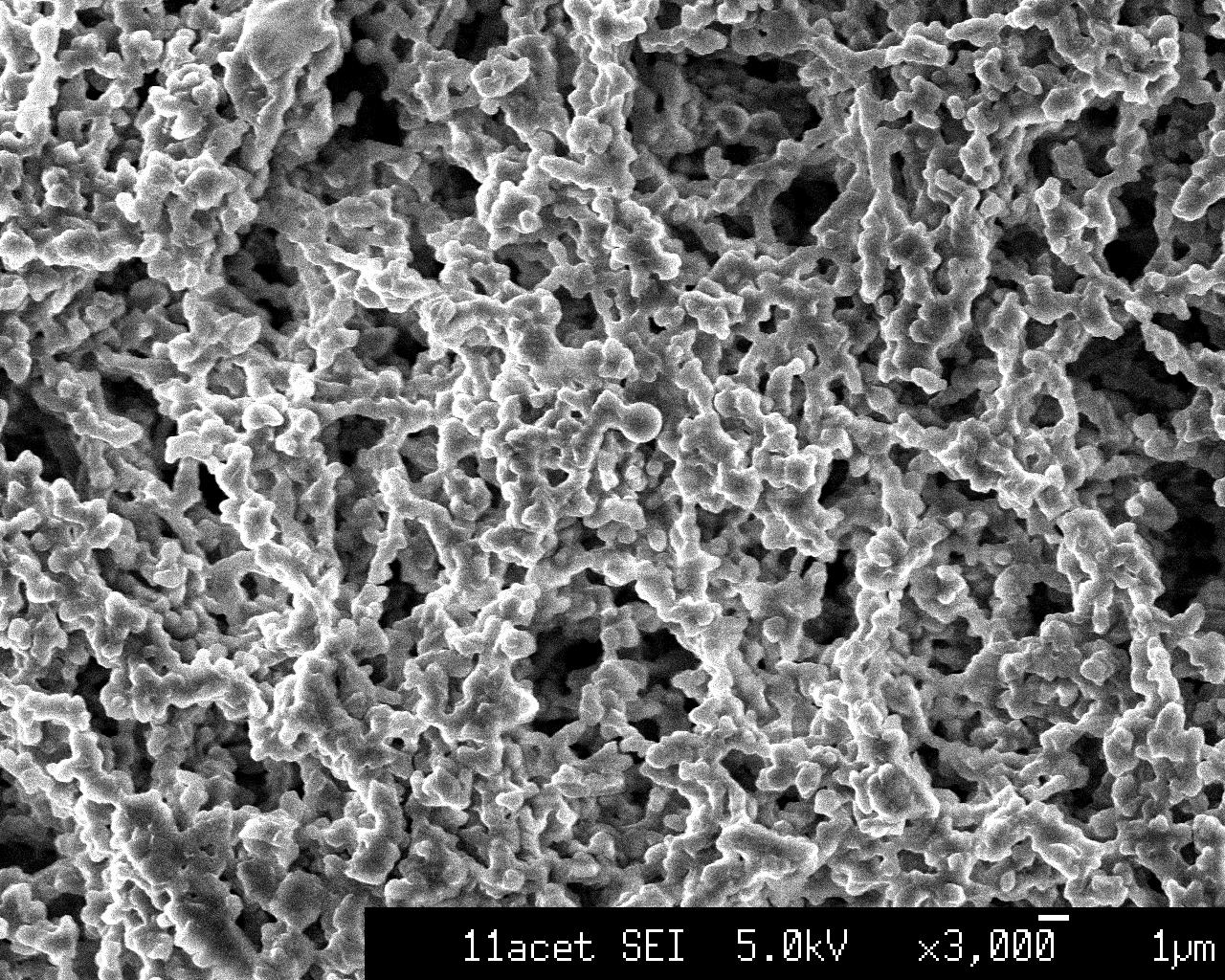 No látex PS-11 1% (m/m), ocorreu coagulação de amostras deixadas em atmosferas saturadas com vapores de acetona, porém não em cetonas de cadeia maior. A formação de um monólito imerso em uma solução de água e acetona ocorreu em 24 horas. A SEM desse coágulo mostra uma rede de elementos alongados formada pelas partículas coalescidas, formando poros da ordem de microns, como mostra a figura. Colocando-se no ambiente