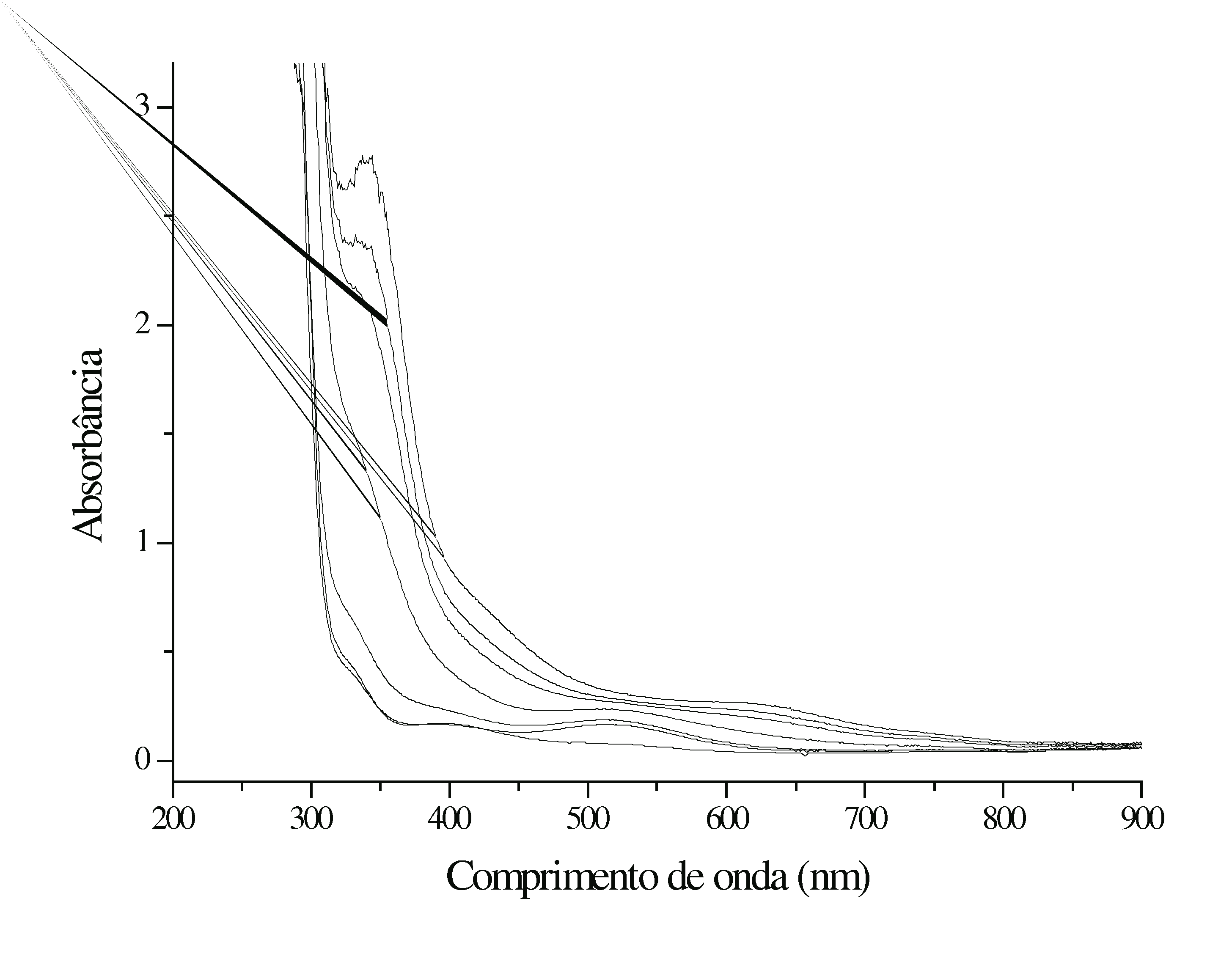 As bandas fracas que aparecem em 1902 cm-1 e 521 nm foram atribuídas à formação de um intermediário de coloração vermelha, de acordo com a reação: