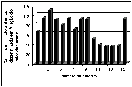 Pelos dados apresentados na figura 1 verifica-se que, das amostras analisadas, 7 apresentaram uma concentração de cloranfenicol 80 % inferior ao valor declarado na bula do medicamento. Cabe ressaltar que as amostras de número 11 a 14 foram amostras grátis.