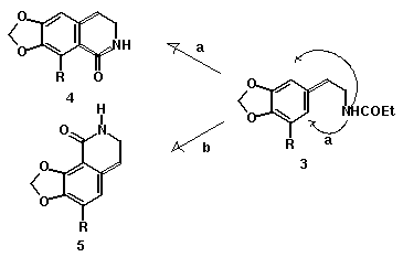 Em um trabalho que visa utilizar adutos de Baylis-Hillman como material de partida para a síntese de alcalóides de Amarillydaceae, era necessário estudar a etapa de ciclização visando a preparação do núcleo fenantridona presente nesses alcalóides (figura 1). Nesse trabalho apresentamos os resultados preliminares de uma estratégia sintética, que visa preparar um modelo que nos permita avaliar preliminarmente o nível de regiosseletividade alcançado (4 versus 5).