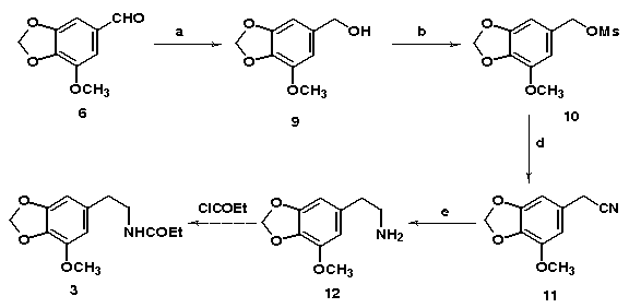 O aldeído 6 foi então submetido a uma sequência de etapas, de maneira a homologar uma unidade de carbono. Assim redução e mesilação, seguida de substituição por cianeto forneceu a nitrila 11, que em seguida foi reduzida para fornecer a amina 12. A partir da amina 12 uma reação com cloroformiato de etila deve fornecer o intermediário necessário à etapa de ciclização (3).