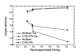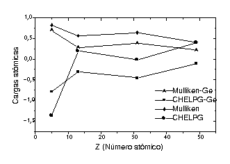 Na figura 1, observa-se que as cargas de Mulliken e CHELP apresentam tendências qualitativas semelhantes em relação a eletronegatividade (c) e ao número atômico (Z). Quantitativamente observa-se um comportamento distinto entre os valores de cargas e sua correlação com as propriedades analisadas, isto é, enquanto o método de Mulliken sugere que as cargas são transferidas de elementos menos eletronegativos (por exemplo, Ga cP=1.81, qM=-0.016), para elementos mais eletronegativos (Ge cP=2,01,qM=--0,365) de acordo com a escala de eletronegatividade de Pauling, no método CHELPG observa-se que as cargas são transferidas dos átomos de germânio para impureza.