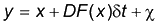 y é a nova coordenada, x é a coordenada inicial, D=0,5, dt é o intervalo de tempo imaginário para o deslocamento, c é uma variável randômica obtida por uma distribuição gaussiana e F é definido pela equação abaixo:
