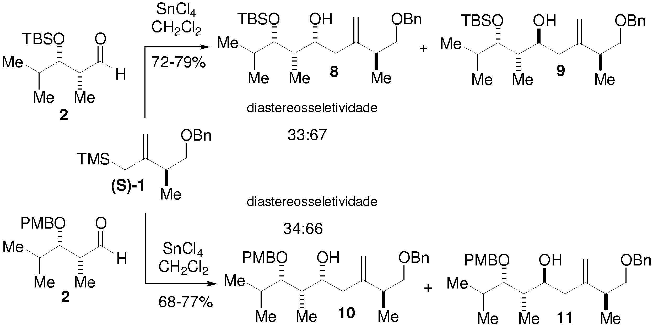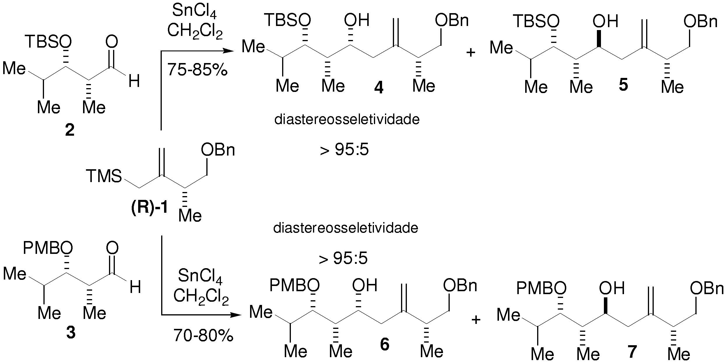 Resultados: A adição do alilsilano (R)-1 aos aldeídos 2 e 3, na presença de SnCl4, conduziu aos produtos 4 e 6, respectivamente, em alta diastereosseletividade, independente do grupo protetor na posição beta (TBS ou PMB).